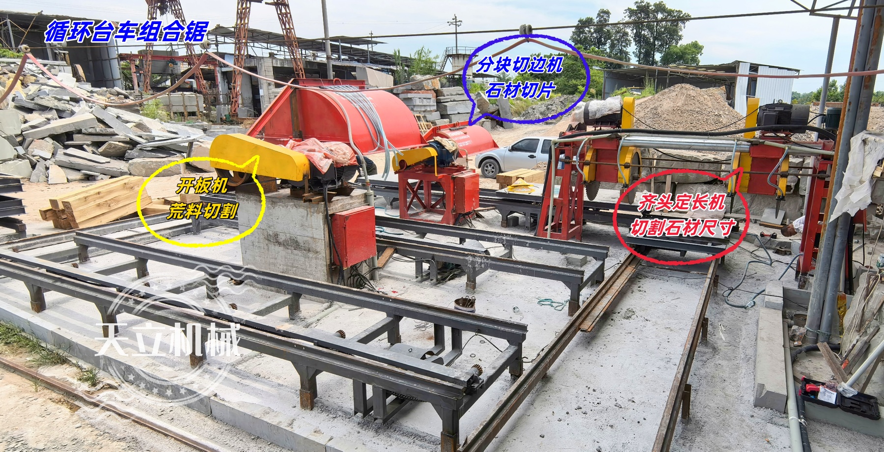 新循環臺車組合鋸由三臺設備組成(開板機、齊頭定長機、分塊切邊機),協同完成荒料開板、定長切割、分塊切邊全流程,構建高效連貫的石材切割生產線。專為路沿石、條石、墓碑石等石材設計,采用循環臺車與高強度鋸條技術,實現連續精準切割,提升生產效率30%以上。